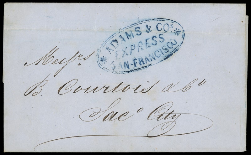 *Adams & Cos. Express * San-Francisco , blue double-oval handstamp on 1853 blue folded cover to Sacramento City Cal.; light horizontal fold through oval, otherwise Very Fine.
