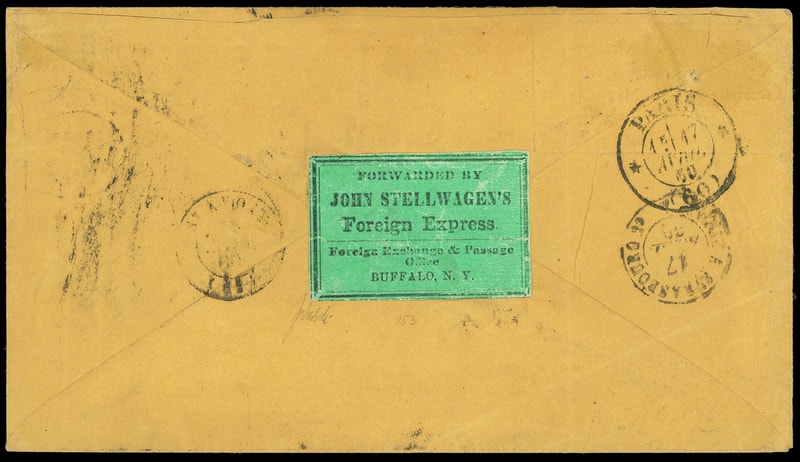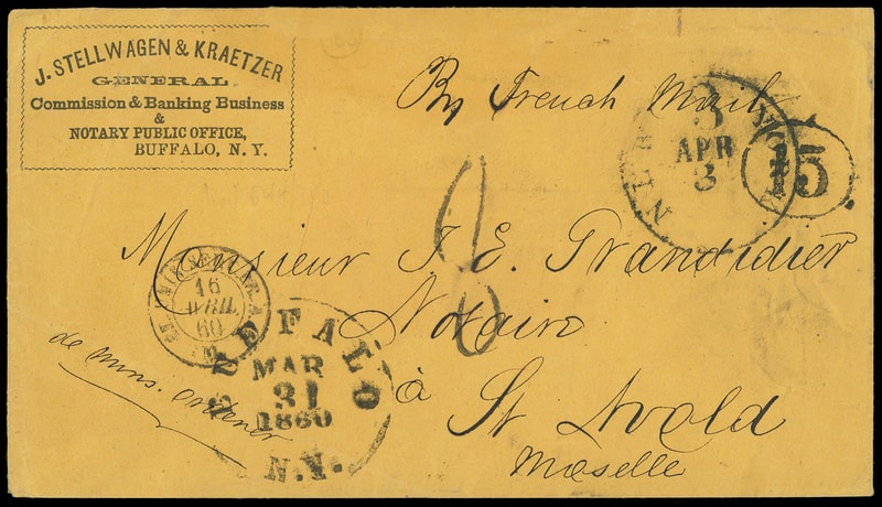 Forwarded by John Stellwagen's Foreign Express, Buffalo, N.Y., black on green label affixed on reverse of 1860 orange J. Stellwagen & Kraetzer, Buffalo N.Y. corner card cover to St. Avold, France , endorsed "By French Mail" at top, "Buffalo N.Y., Mar 31, 1860" cds and matching "15" oval rating handstamp, "New York '3' Apr 3" debit exchange cds, French (4.16.60) entry cds and "8" decimes due handstamp, reverse with Paris (4.17) transit and St. Avold arrival cds; bit of abrasion at top, Very Fine.