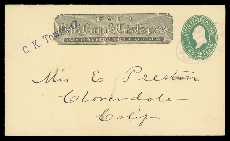 Wells, Fargo & Co's Express, Sebastopol, Cal., purple oval cancels 2¢ green entire with printed "Wells Fargo & Co." frank and purple "C. K. Tower - C." route agent handstamp (Leutzinger type 23) to Cloverdale Cal., Very Fine, ex-Leutzinger, Tatham .