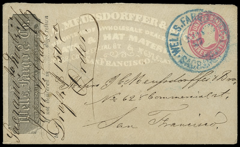 Wells, Fargo & Co., Sacramento, Nov 27, blue company cds on 3¢ pink (U58) entire with gray "J.C. Meussdorffer & Bros., Hats & Hat Material, San Francisco" shaded ad to San Francisco, docketed "Sacramto. Noby 27/67, John F. Slater, Draft $150.00 Order" at left, Very Fine.