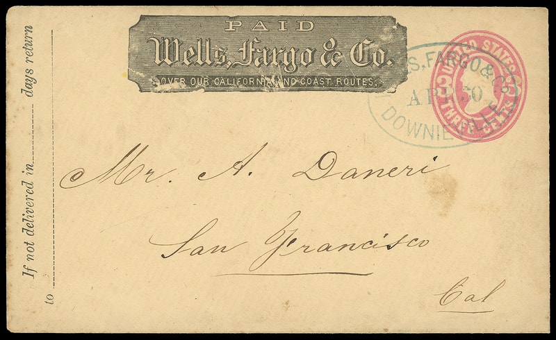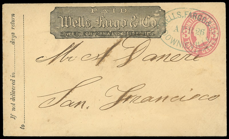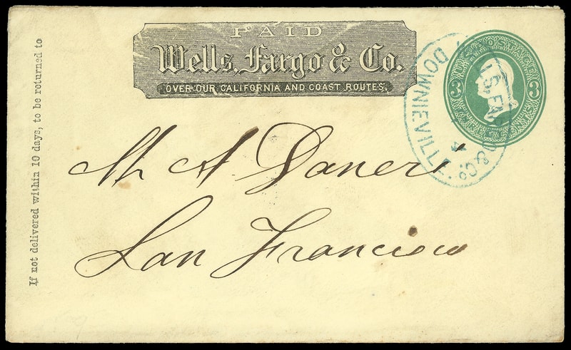 Wells, Fargo & Co., Downieville, Apr 30, sharp blue oval datestamp cancels 3¢ pink (U59) buff entire with printed "Wells, Fargo & Co." frank to San Francisco Cal., Very Fine strike.