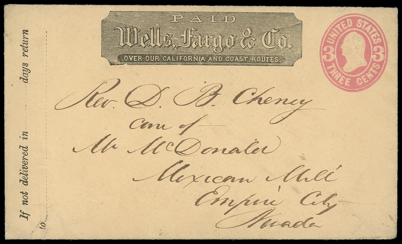 Wells, Fargo & Co., printed frank on 3¢ pink (U59) buff entire uncanceled to Mexican Mill, Empire City, Nevada, Very Fine.