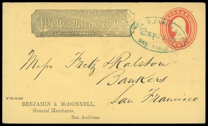 Wells, Fargo & Co. Express, San Andreas, blue oval cancels 3¢ red (U10) buff entire with printed "Wells, Fargo & Co." frank and "Benjamin & McDonnell, General Merchants, San Andreas" corner card to San Francisco Cal., Very Fine.