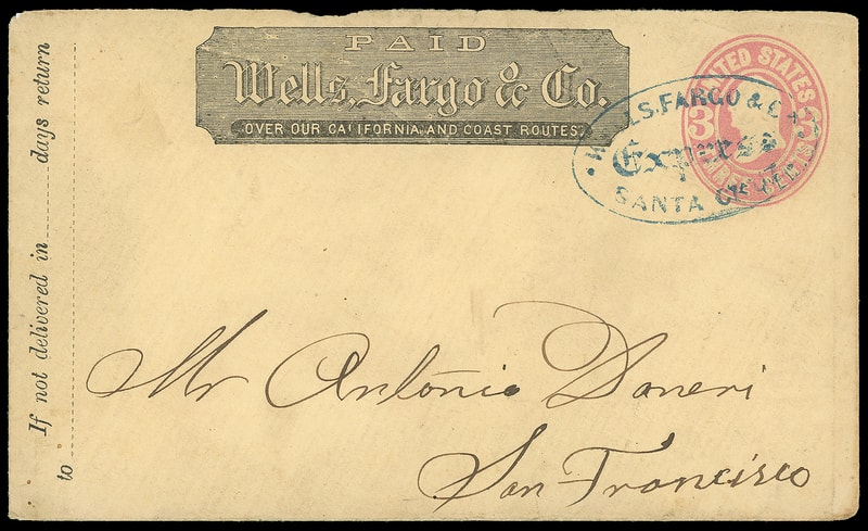 Wells Fargo & Co. Express, Santa Cruz, blue oval cancels 3¢ pink (U59) buff entire with printed "Wells Fargo & Co." frank to San Francisco Cal., "Daneri & Co., San Francisco, Cal. Jun 24, 1867" company arrival backstamp; no flap, otherwise Very Fine.