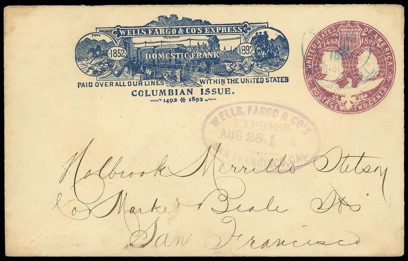 Wells, Fargo & Co's Express, San Francisco, Cal. Aug 28, purple oval on 2¢ Columbian (U349) entire with blue Wells Fargo 1892 Columbian Issue frank canceled by blue "So. Pac. Co., Cornwall, Aug 28" double-circle datestamp, blue "Holbrook, Merrill & Stetson, S.F., Aug 2, 1893" double-oval backstamp, Very Fine.