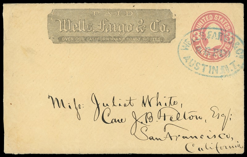 Wells, Fargo & Co., Austin N.T., Sep 10 (Nevada Territory), clear blue oval cancels 3¢ pink (U59) buff entire with printed "Wells, Fargo & Co." frank to San Francisco Cal.; reduced at left with tiny tear, otherwise Very Fine.