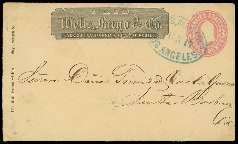 Wells, Fargo & Co., Los Angeles, Jun 17, bold blue oval cancels 3¢ pink (U59) buff entire with printed "Wells, Fargo & Co." frank to Santa Barbara Cal.; partial bottom flap with couple tiny edge tears, Very Fine.