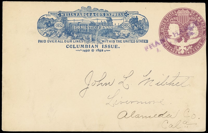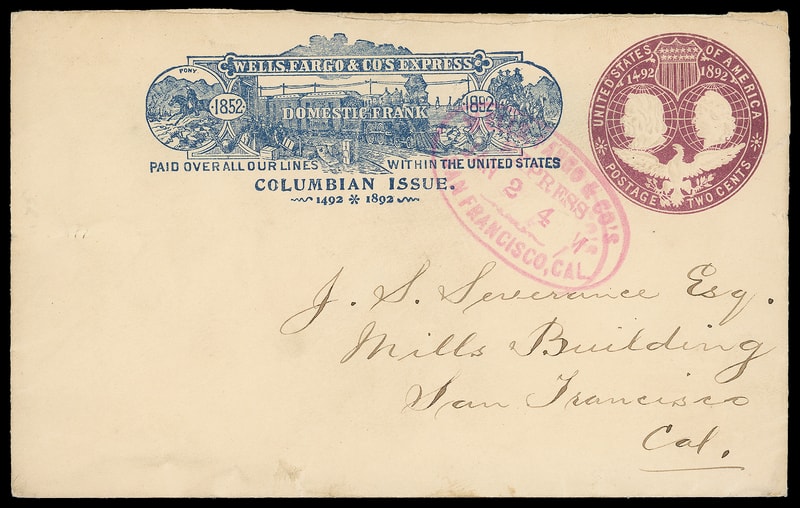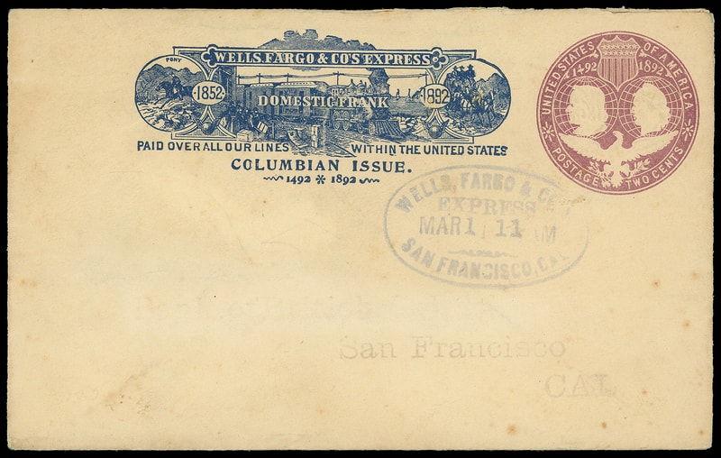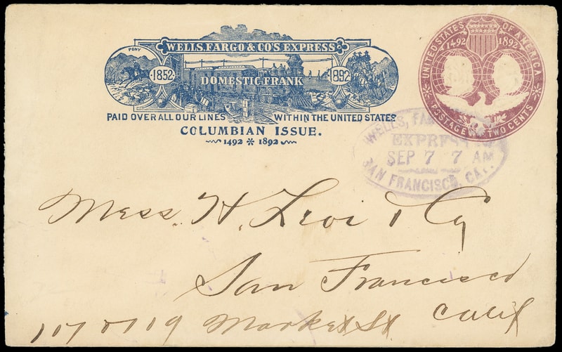 Wells, Fargo & Co. Express, San Francisco, Cal. Sep 7, purple company oval cancels 2¢ Columbian (U349) entire with blue 1892 Wells Fargo "Columbian Issue" Domestic printed frank to San Francisco Cal., Very Fine.