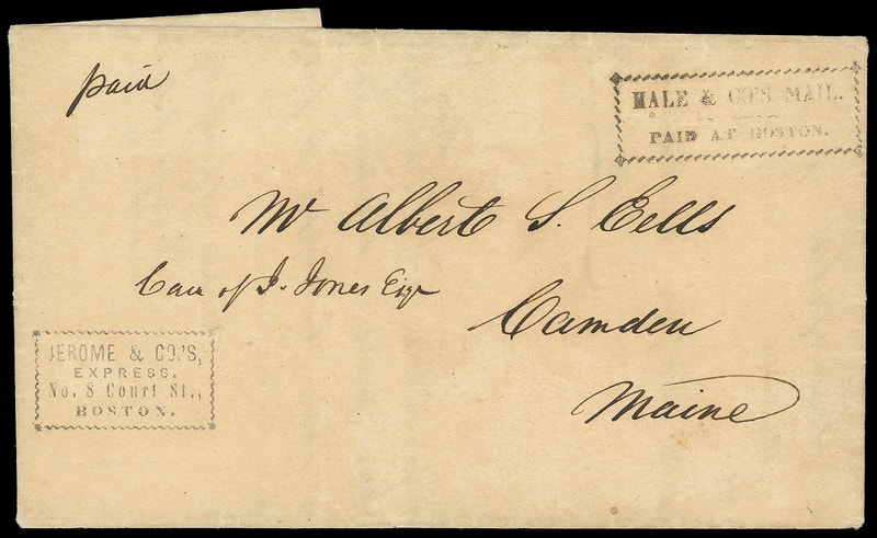 Jerome & Co. Express, No. 8 Court St., Boston, complete ornate rectangular handstamp on 1844 folded letter from Boston Mass. to Camden, Me., additional fancy rectangular boxed handstamp " Hale & Co's Mail, Paid at Boston " upper right and additional "Paid" manuscript, Very Fine and choice conjunctive use.