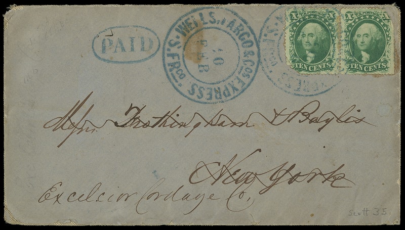 Wells Fargo & Cos Express, S. Frco. 10 Feb, blue double-circle datestamps tie two 10¢ green (35) singles, faulty corners, additional matching blue "Paid" in oval on gray linen-lined cover to New York City, reverse with blue "William Newell & Co., San Francisco" oval; stain spot, edge wear, light soiling and edge wear still, F.-V.F.