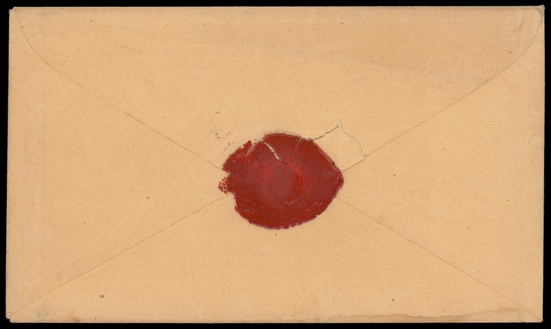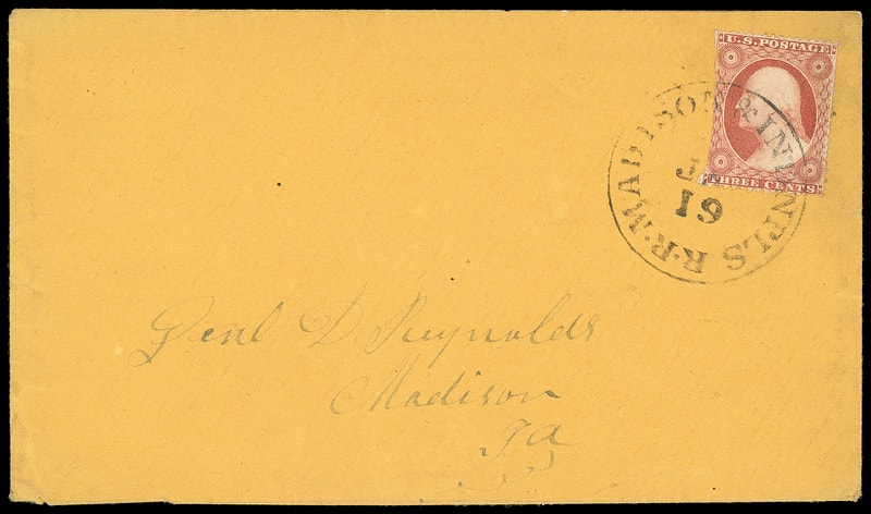 Madison & Indnpls. R.R. Jan 19", route agent cds ties 3¢ dull red (26) , s.e. at left, on orange cover to Madison, Indiana, Very Fine strike.