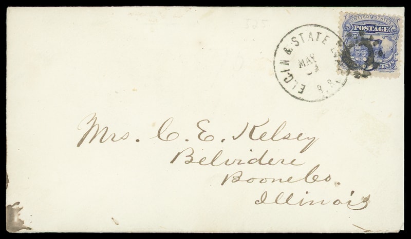 Elgin & State Line R.R, May 24, route agent cds duplexed with unusual cogwheel fancy cancel ties 3¢ ultramarine (114) on cover to Belvidere Ill.; some extra ink bottom left, Very Fine.