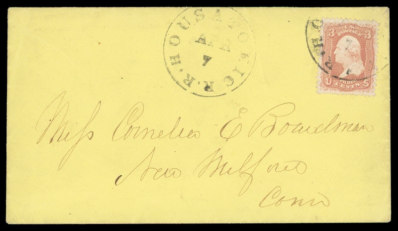 Housatonic R.R. Apr 7, clear route agent cds strike, second partial ties well centered 3¢ rose (65) on yellow cover to New Milford Conn., fresh and Very Fine, Rarity VII .