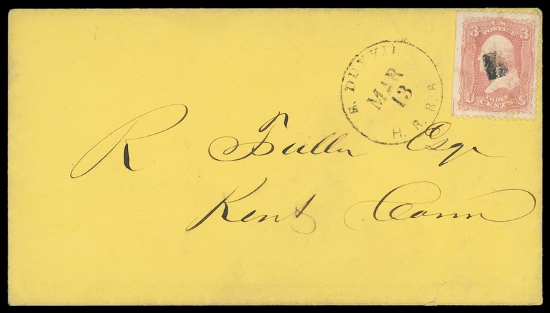 (Hudson River Rail Road) S. Duyvil, H.R.R.R., Mar 13, sharp strike of station cds, matching square cork cancel on 3¢ rose (65) nat. s.e. straddle single, on immaculate yellow cover to Kent, Conn., fresh and Very Fine.