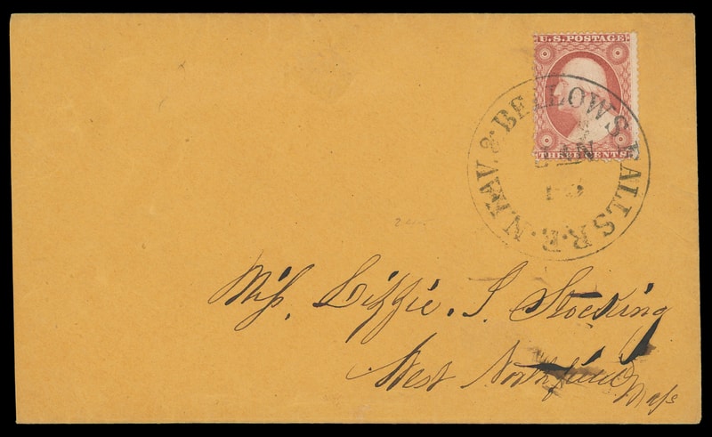 (New Haven & Bellows Falls Rail Road) "N. Hav. & Bellows Falls R.R., Jan 13", choice strike ties 3¢ dull red (26) on orange cover to West Northfield Mass.; reduced slightly at left, Very Fine and choice railroad use, Rarity VIII .