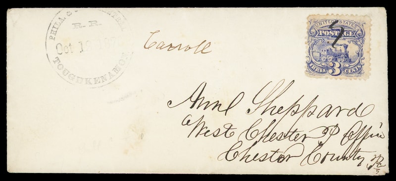 (Philadelphia & Baltimore Central R.R.) Phila. & Balt. Central R.R., Toughkenamon, Oct 12, 1870, light strike on cover bearing 3¢ ultramarine (114) canceled by ms. squiggle to West Chester Pa., ms. "Carroll" notation, Very Fine, Rarity VI .