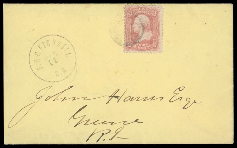 (Providence, Hartford & Fishkill) "P. H. & Fishkill R.R., Mar 11", route agent cds with matching target cancel ties 3¢ rose (65) on yellow cover to Greene R.I.; reduced slightly at left, Very Fine.