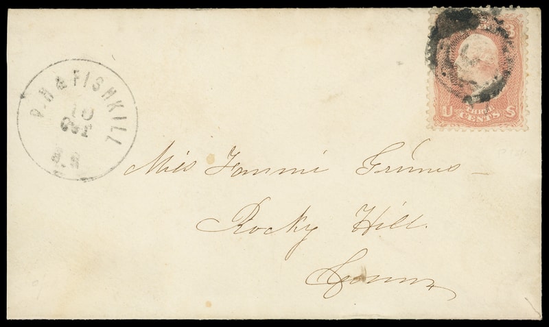P. H. & Fishkill R.R., 10 Oct (Providence, Hartford & Fishkill R.R.), sharp route agent cds, matching ring cancel ties 3¢ rose (65) on cover to Rocky Hill Ct.; reduced slightly at left and tiny corner tear, fresh and Very Fine Connecticut railroad use.