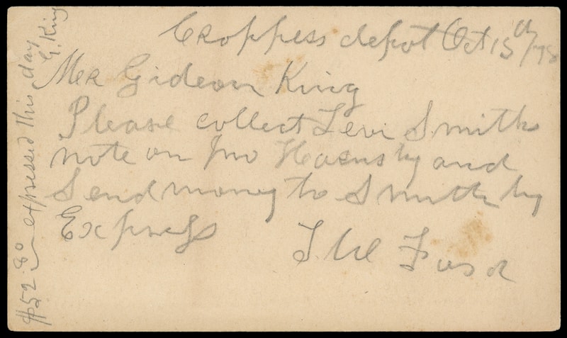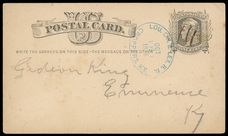 (Louisville, Cincinnati & Lexington R.R.) Lou. Cin & Lex. R.R., Croppers, Ky. Oct 15, 1878, postal card datelined "Croppers Depot, Oct 15, 1878" to Emminence, Ky.; corner crease, F.-V.F. and unlisted station oval.