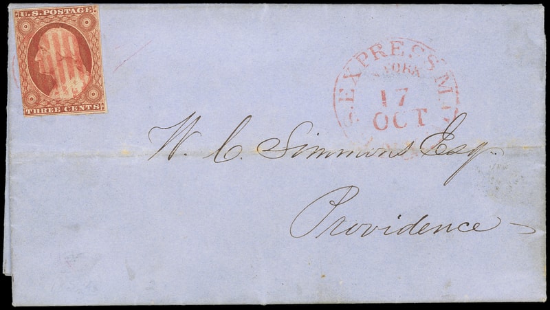 U.S. Express Mail, N.Y. 'N. York' 17 Oct, red route agent cds with matching bold circular grid cancel ties 3¢ orange brown (10A) , small corner crease, on blue 1851 folded letter to Providence R.I., Very Fine and scarce red strike.
