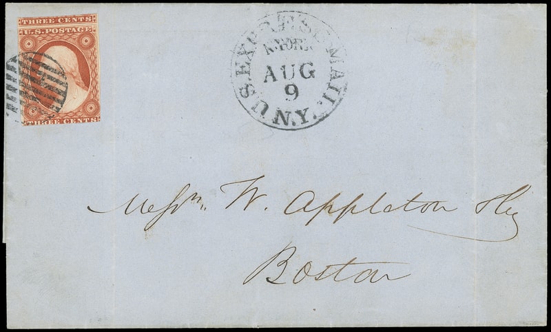 U.S. Express Mail, N.Y. 'N. York' Aug 9, neat route agent cds with matching bold circular grid cancel ties 3¢ orange brown (10) , miscut showing complete adjacent label at top, on blue 1851 folded cover to Boston Mass., Very Fine.
