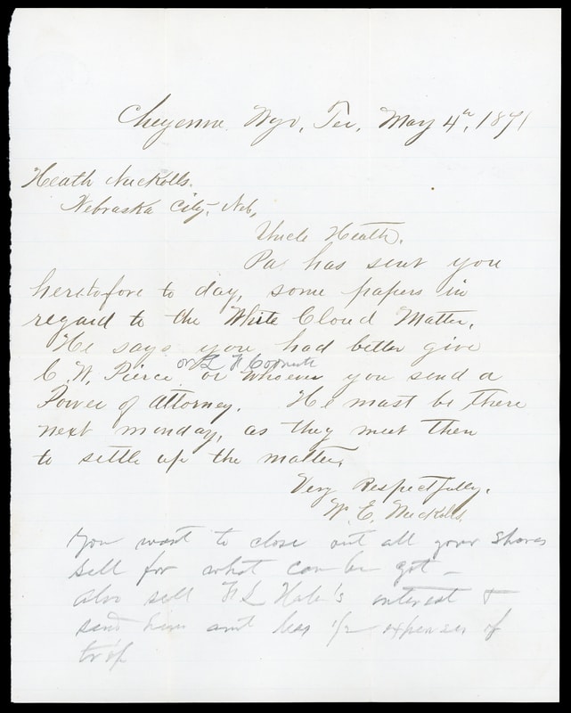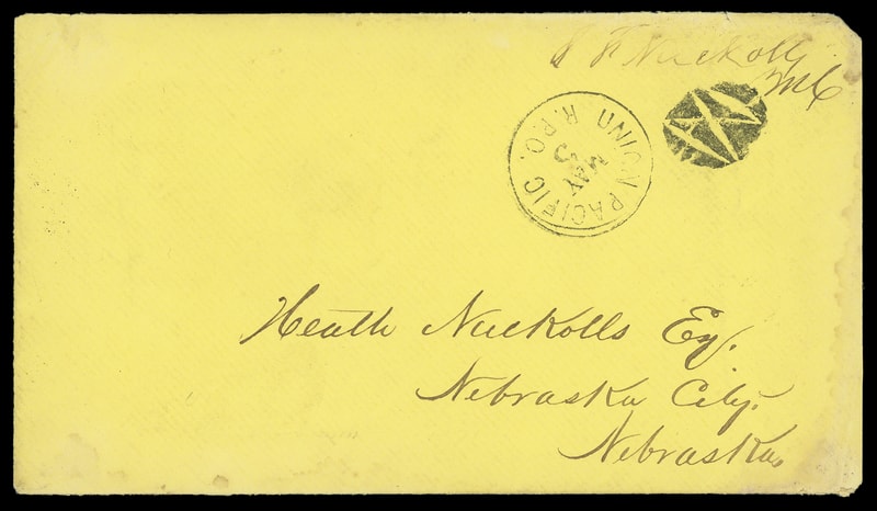 Union Pacific R.P.O., May 5, railroad agent duplex with fancy geometric cancel on yellow cover free franked "S.F. Nuckolls, MC" to Nebraska City, Nebr., original letter datelined "Cheyenne Wyo. Ter. May 4th. 1871" concerning family business matters including the White Cloud matter; corner nick and faint stain at right, F.-V.F. railroad use from Wyoming Territory.