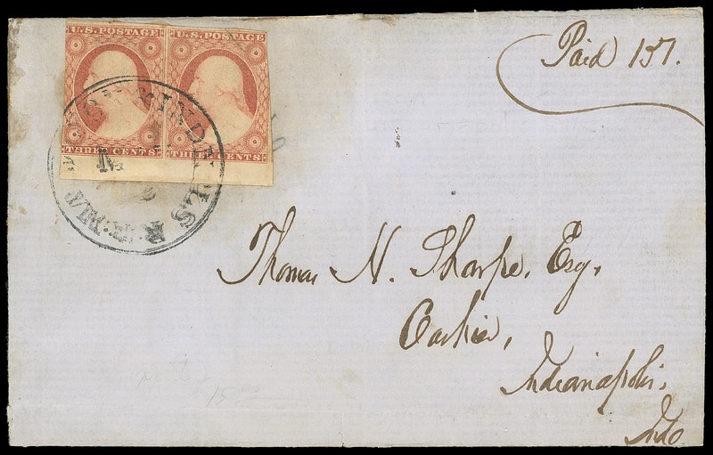 Madison & Indnpls. R.R. May 2", route agent cds ties 3¢ dull red (11A) bottom sheet margin pair on blue folded cover to Indianapolis, Indiana, ms. "Paid 151." box notation at top right; right 3¢ tears, some reinforced fold splitting, Fine and scarce.