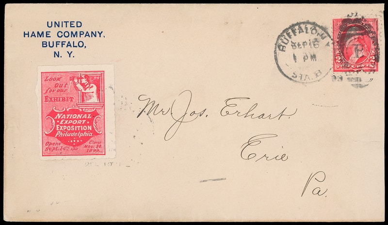 1899 Philadelphia National Export Exposition, red on white label affixed on cover bearing 2¢ red (279B) tied by "Buffalo, N.Y. Sta. B, Sep 16 '99" duplex on United Hame Company corner card cover to Erie Pa., reverse with Erie (9.16) machine arrival; edge tear at right, otherwise Very Fine.
