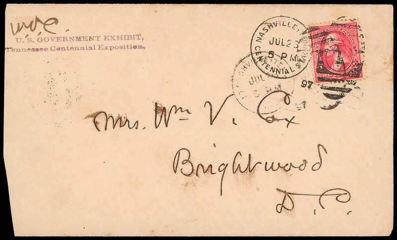 (1897 Nashville) Nashville, Tenn., Centennial Sta. Jul 23, 97, double strike of duplex ties 2¢ rose carmine (279B) on cover with " U.S. Government Exhibit, Tennessee Centennial Exposition " two-line corner card handstamp to Brightwood D.C., Washington D.C. (7.25) and Brightwood (7.25) arrival backstamps; reduced at left, F.-V.F. and scarce.