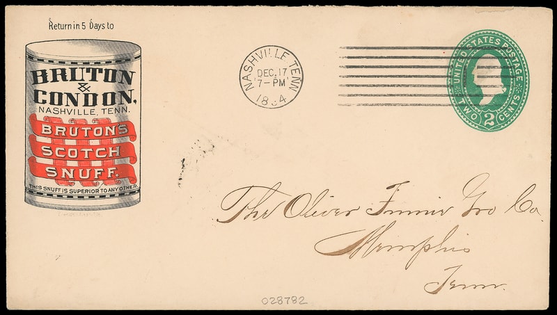 1896 The Great Tennessee Centennial Exposition, Nashville, Tenn., all-over 1896 ad on reverse of 2¢ entire with Bruton & Condon Scotch Snuff illustrated ad canceled by "Nashville enn. Dec 17, 1894" machine cancel to Memphis Tenn.; small flap tear, Very Fine and spectacular expo advertising design.