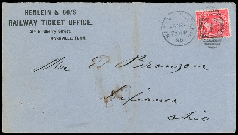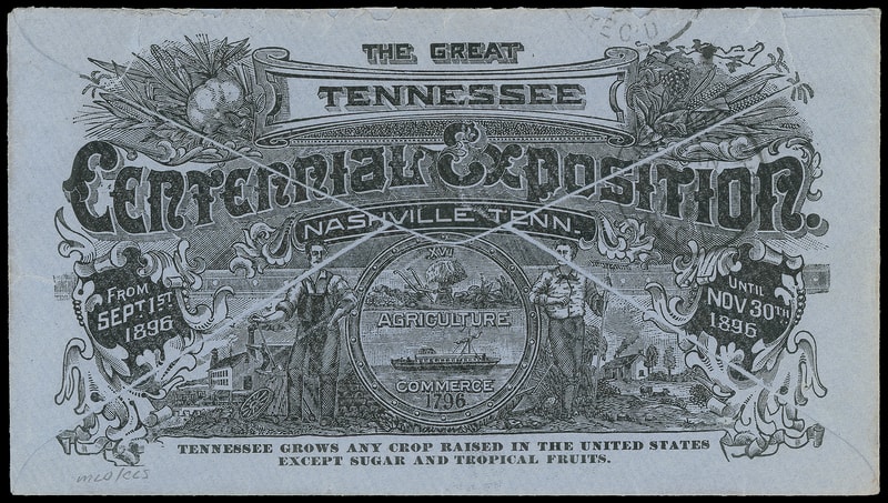 1896 The Great Tennessee Centennial Exposition, Nashville, Tenn., 1896 all-over expo ad design on reverse of blue Henlein & Co.'s Railway Ticket Office corner card cover bearing 2¢ pink Bureau issue tied by "Nashville, Tenn. Jan 8, 96" duplex to Defiance, Ohio; small flap tear and bit missing, Very Fine and spectacular expo advertising design.