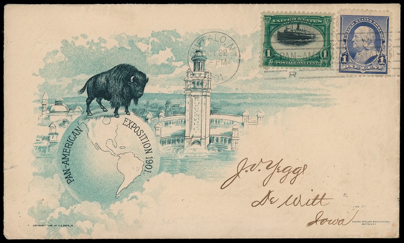 (1901 Buffalo) Pan-American Exposition, illustrated greenish blue and black expo advertising design on cover bearing 1¢ blue (219) and 1¢ Pan American (294) tied by "Buffalo, N.Y., Oct 22, 1901" machine cancel (B01-07) with "Paid-American Station, R" slogan to DeWitt, Iowa; Oct. 23rd arrival backstamp, Very Fine and scarce greenish expo cover.