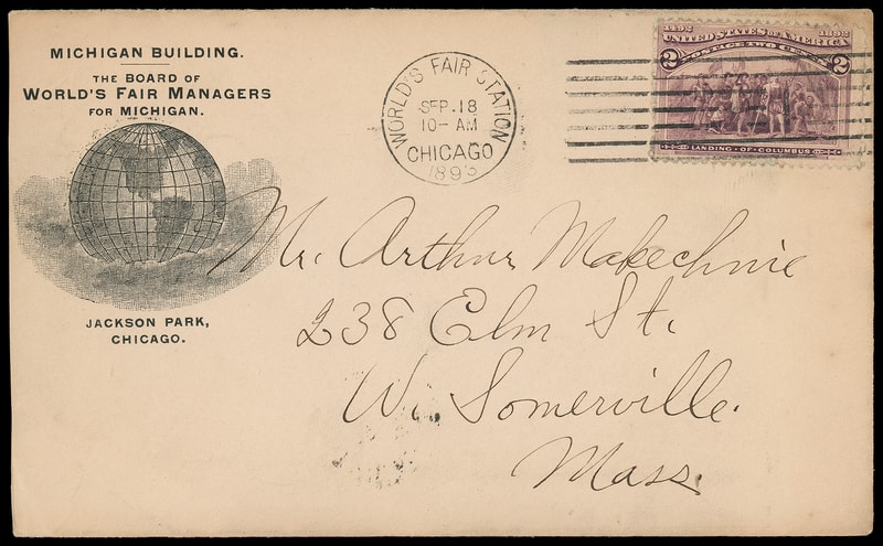 (1893 Chicago) World's Fair Station, Chicago, Sep 18, 1893, expo machine cancel ties 2¢ Columbian (231) on illustrated Michigan Building, The Board of World's Fair Managers for Michigan corner card cover to West Somerville Mass., reverse with Boston (9.19) and Somerville arrival cds; reduce a bit at left, Very Fine.
