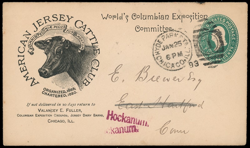 (1893 Chicago) World's Columbian Exposition Committee, American Jersey Cattle Club, illustrated corner card showing Jersey Dairy cow on 2¢ green entire canceled by "Hyde Park Sta. Chicago Ill. Jan 25 '93" duplex to East Hartford Conn., Jan. 27th arrival backstamp and forwarded to Hockanum arriving same day, original matching illustrated letterhead top half.