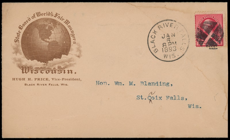 (1893 Chicago) Wisconsin State Board of World's Fair Managers, illustrated brown design on buff cover bearing 2¢ carmine (220) tied by quartered cork duplexed with "Black River Falls Wis. Jan 6, 1893" duplex to St. Croix Falls Wisc.; reduced slightly at right and light water stain, F.-V.F.