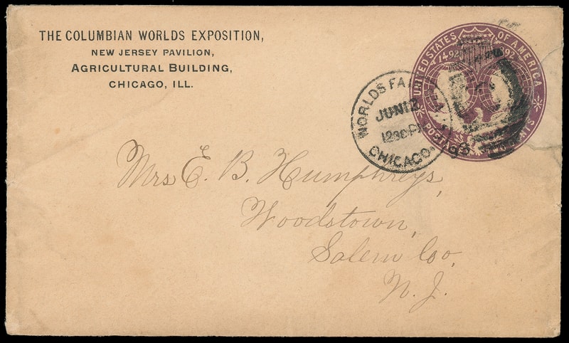 (1893 Chicago) Worlds Fair Sta., Chicago, Ill. Jun 12 '93, duplex on 2¢ Columbian (U349) entire with The Columbian World's Exposition, New Jersey Pavilion, Agricultural Building corner card to Woodstown N.J.; opening tear affects indicia, slight aging, Fine appearance.
