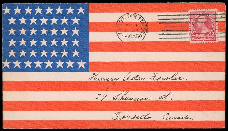 (1893 Chicago) World's Fair Station, Chicago, Oct 9, 1893, expo machine cancel ties 2¢ camrine (220) on overall Flag Patriotic cover to Toronto, Canada , Very Fine and attractive expo use.