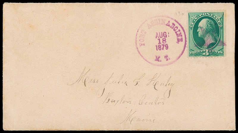Fort Assinaboine, M.T. Aug 18, 1879, purple cds duplexed with star cancel ties 3¢ green (184) , s.e. at right, on cover to Buxton Center Me.