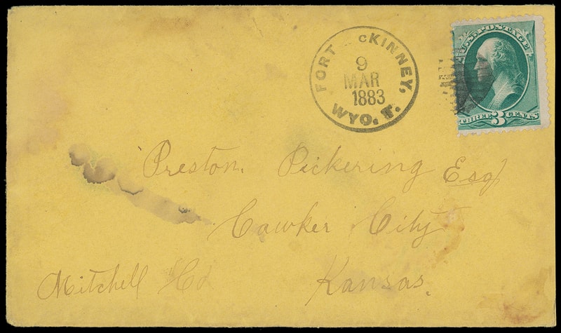 Fort McKinney, Wyo. T. 9 Mar 1883 (Wyoming Territory), cds duplexed with grid cancel ties 3¢ green (207) on yellow cover to Cawker City, Kansas; reduced slightly at right, light staining, Fine.