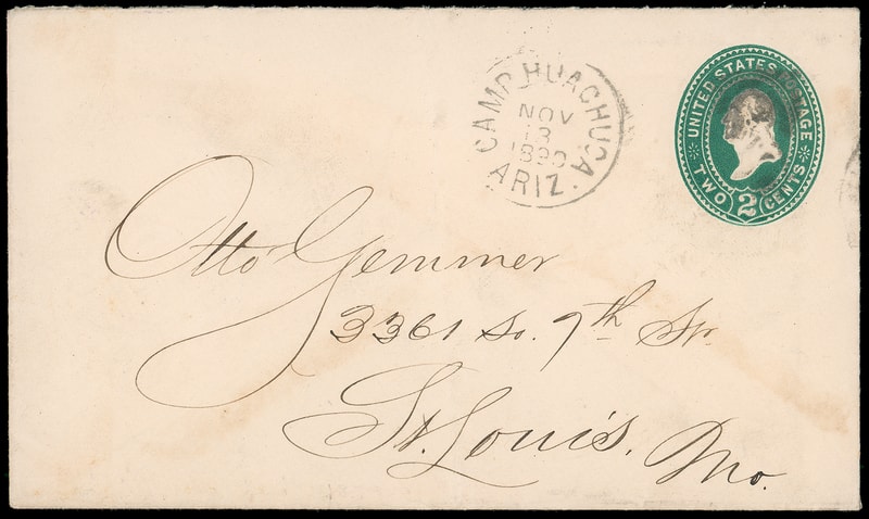 Camp Huachuca, Ariz. Nov 13, 1890 (Arizona Territory), cds duplexed with cork cancel on 2¢ green entire to St. Louis Mo., reverse with Nov. 17th arrival backstamps, F.-V.F. and scarce Az. Terr. Fort.