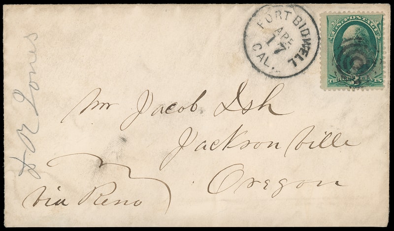 Fort Bidwell Cal. Apr 17, strong cds duplexed with four-ring cancel on cover to Jacksonville, Oregon; light soiling, F.-V.F.
