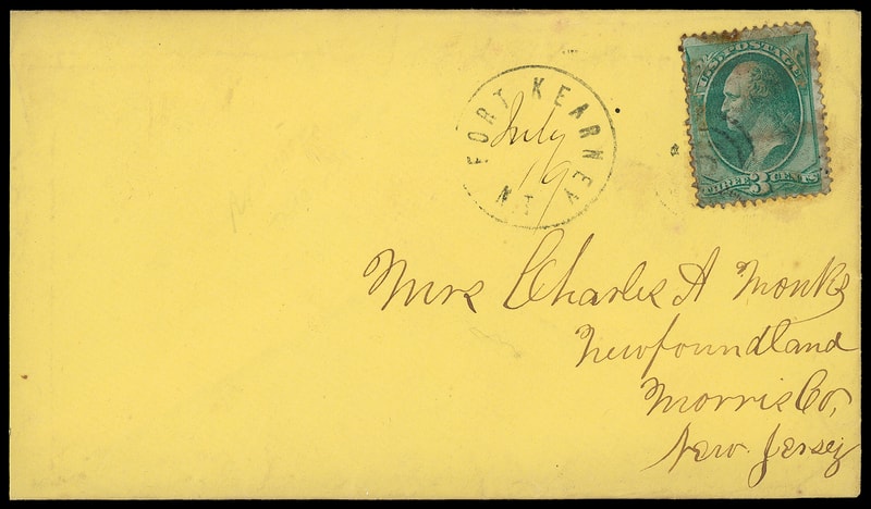Fort Kearney N.T. "July 19", cds with ms. dating on cover bearing 3¢ green (147) canceled by light four-ring target to Newfoundland N.J.; reduced slightly at left; 3¢ gum toning, Fine and late use.