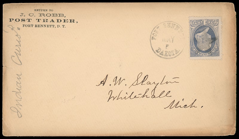 Fort Bennett, Dakota, May 5 (Dakota Territory), cds duplexed with star cancel on 1¢ gray blue (206) on unsealed J.C. Robb, Post Trader corner card cover to Whitehall Mich. at 1¢ printed matter rate, pencil "Indian Curios" docketing at left; edge toning and wear, Fine.