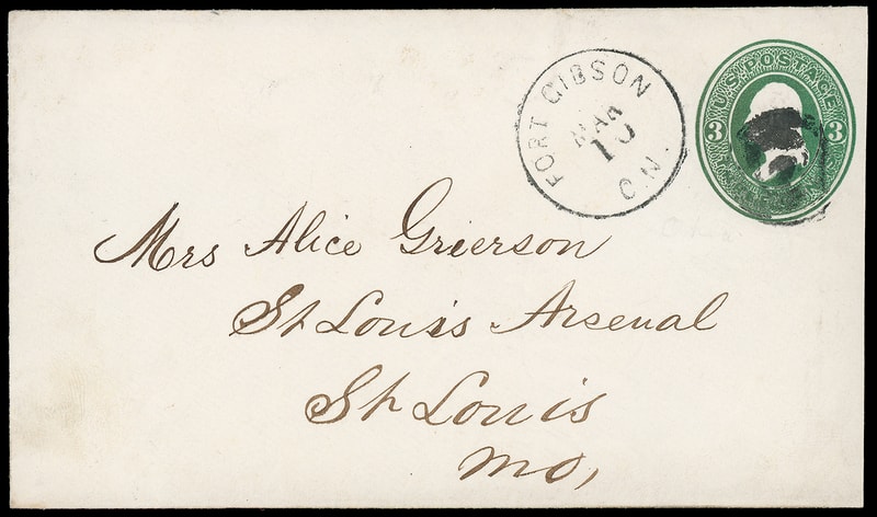 Fort Gibson C.N. Mar 10 (Cherokee Nation, Indian Territory), neat cds with matching overinked target cancel on 3¢ green entire to St. Louis Arsenal, St. Louis Mo.; reduced slightly at right, Very Fine.