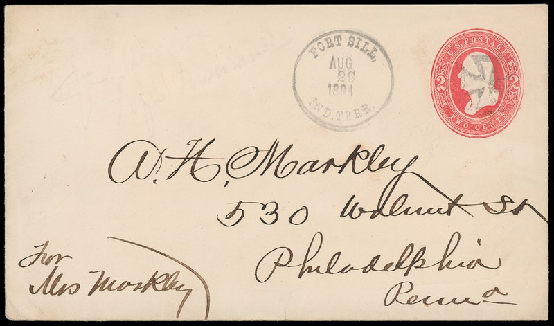 Fort Sill, Ind. Terr. Aug 29, 1884 (Indian Territory), sharp cds duplexed with Maltese cross cancel on 2¢ red entire to Philadelphia Pa., Sep. 3rd arrival backstamp, fresh and Very Fine.