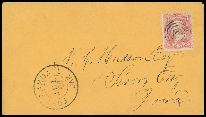 Fort Randall, Dak. Jul 22, sharp strike of double-circle postmark and matching four-ring target cancel 3¢ rose (65) on orange cover to Sioux City, Iowa; addressing ms. just ties 3¢, Very Fine and choice Dakota Territory Fort use.