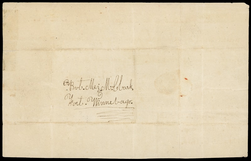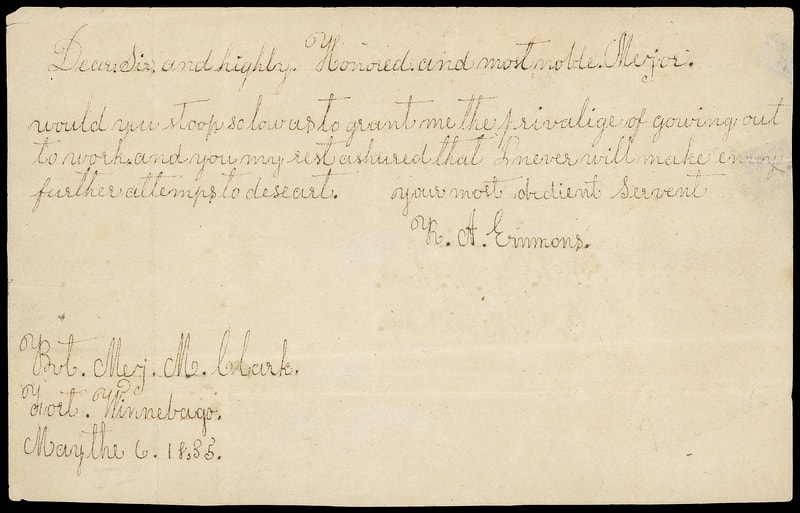 "Fort Winnebago, May the 6. 1835" (Wisconsin), folded local letter addressed to "Bvt. Maj. M. Clark" from R.A. Eammons reading " Dear Sir, and highly Honored and most noble Major, would you stoop so low as to grant me the privalige of gowing out to work and you my rest ashured that I never will make enny further attemps to deseart… ", Very Fine and early military use.