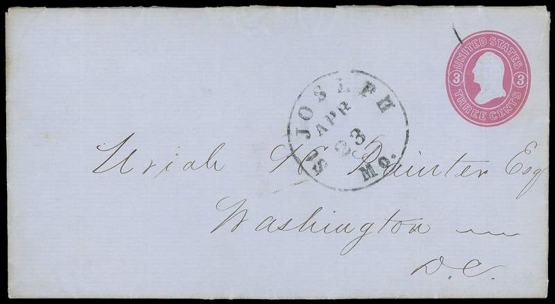 Lettersheet, 1861, Nesbitt 3rd Issue, 3¢ pink on blue, canceled by "St. Joseph Mo. Apr 23" cds to Washington D.C., letter between friends with some interesting content "……Washington, I pit anybody that has to be kept at that place long, though for curiosity's sake I wouldnt object to being there long enough to see the place…"; opened at top, Very Fine and scarce lettersheet use.