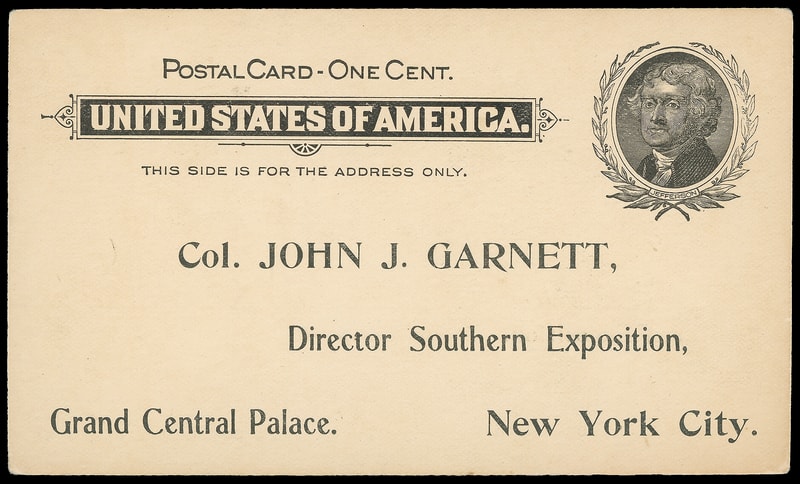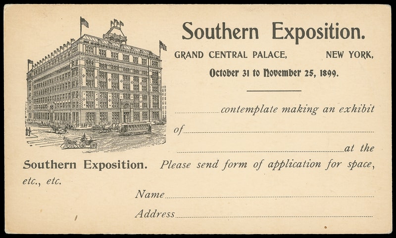 Postal Card, 1897, 1¢ black on buff, unused card with preprinted 1899 " Southern Exposition " advertising design on message side for solicitation of exhibits, Very Fine and rare expo advertising.