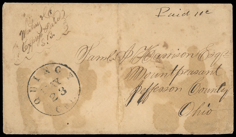 Whiting & Co Express Paid, S.B., manuscript express company notation (with the SB likely standing for Stage Business) on stampless cover to Ohio, entered the mails with "Quincy, Cal. May 23" large cds and manuscript rate marking "Paid 10c"; likely very early use from Whiting & Co.'s Express before they had printed franks prepared; staining with ironed out heavy vertical crease and toned, Good.